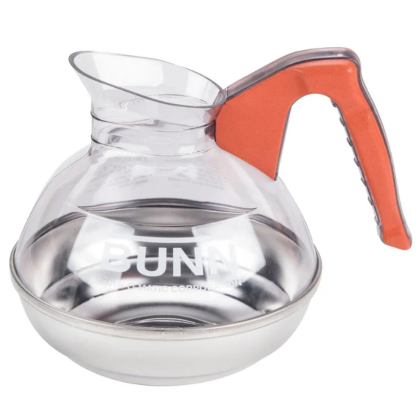 Product Name: Bunn Easy Pour Coffee Pot – 12 Cup – Plastic with Stainless Bottom, Orange Handle (Decaf), Each